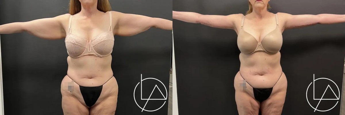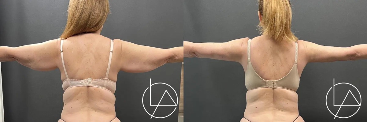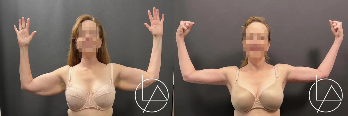 This lovely patient underwent an upper arm liposuction with arm lift. 360 liposuction was performed, focusing on the upper arms and blending with the shoulder, underarm area, and forearms. After the liposuction was completed, an arm lift was performed to remove the excess skin to create a beautiful, natural contour. Her recovery went well, and she is very happy with her results, which will continue to improve in the coming months.