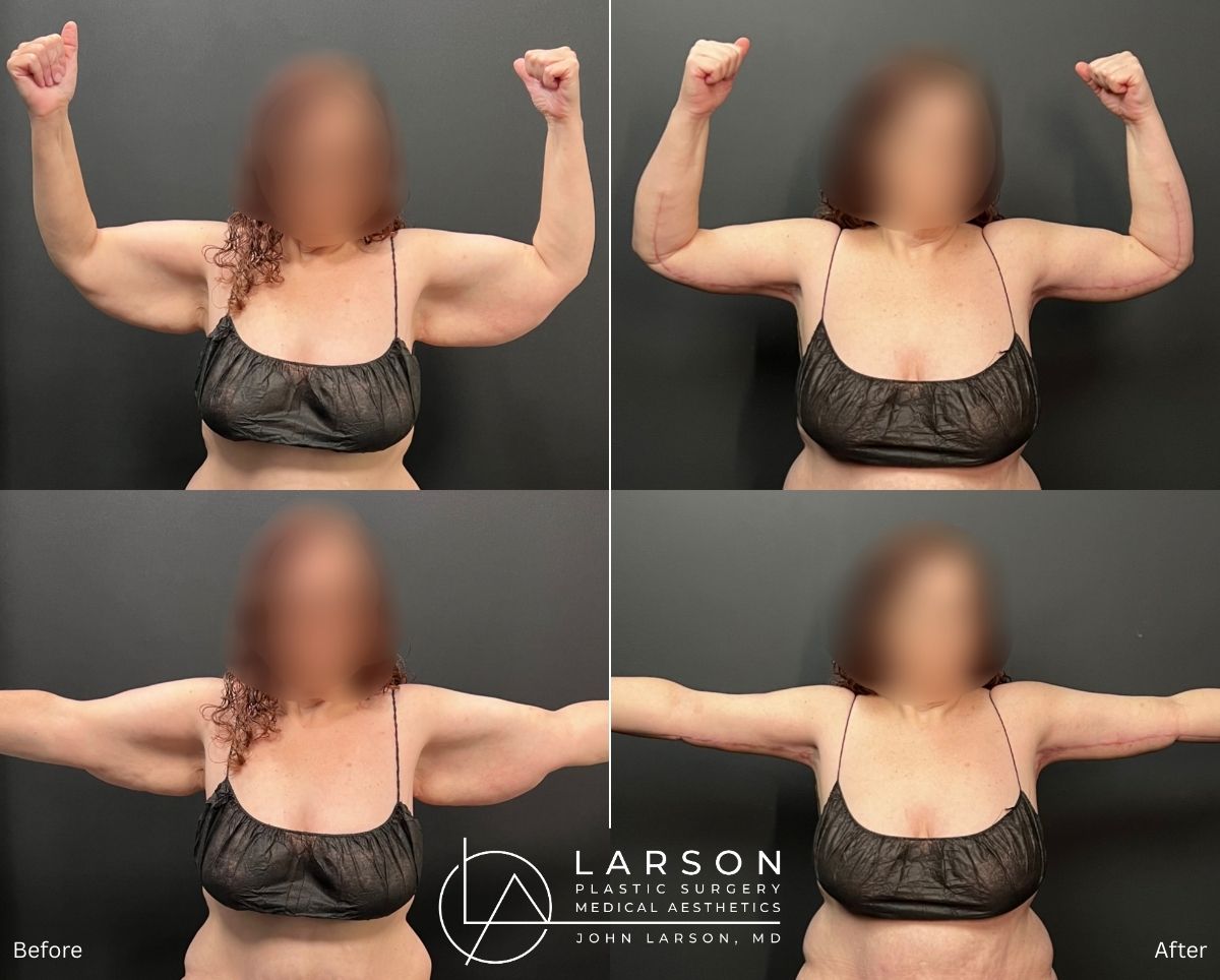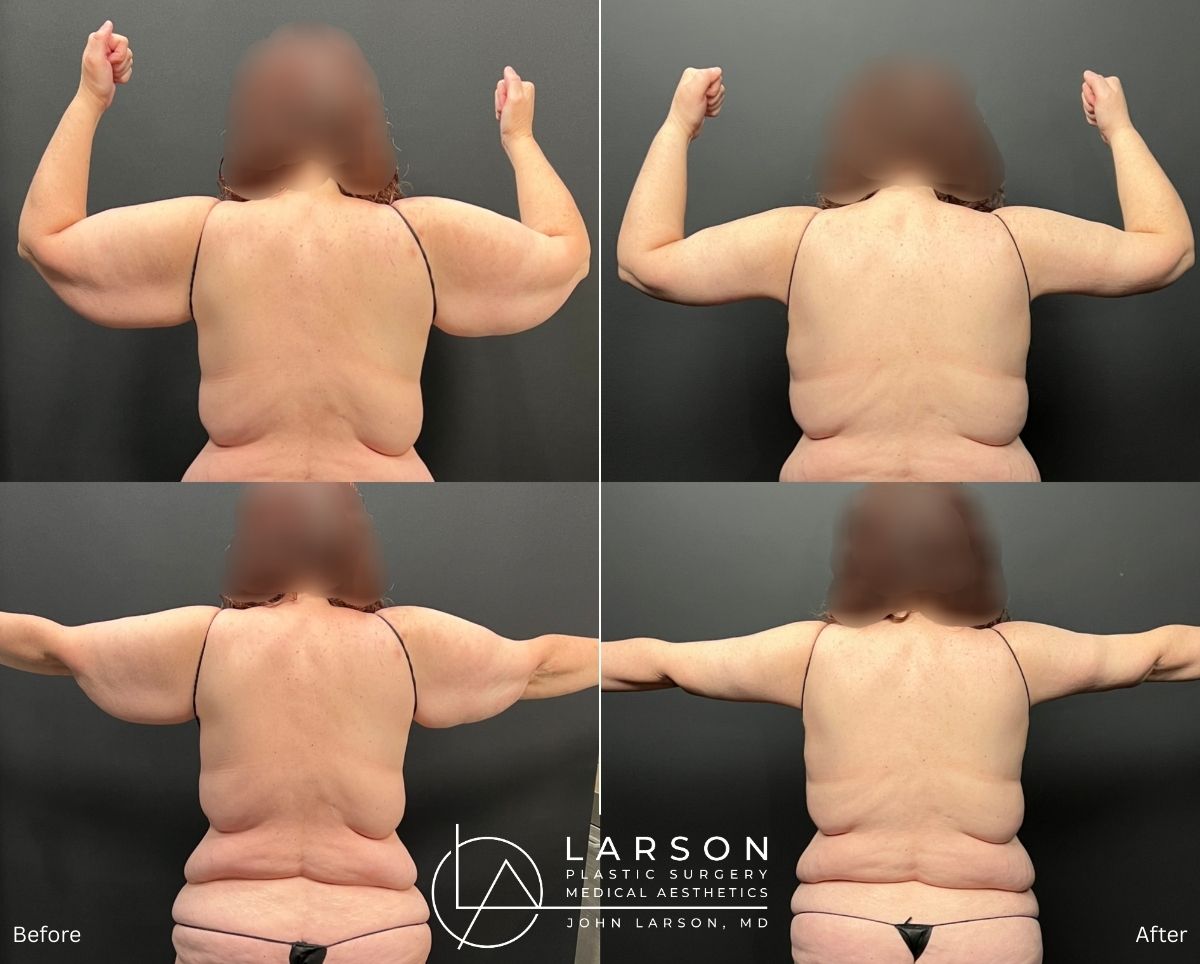 - Power-assisted liposuction of bilateral arms + extended brachioplasty → Removed 1.25 liters from each arm (2.5 liters total)