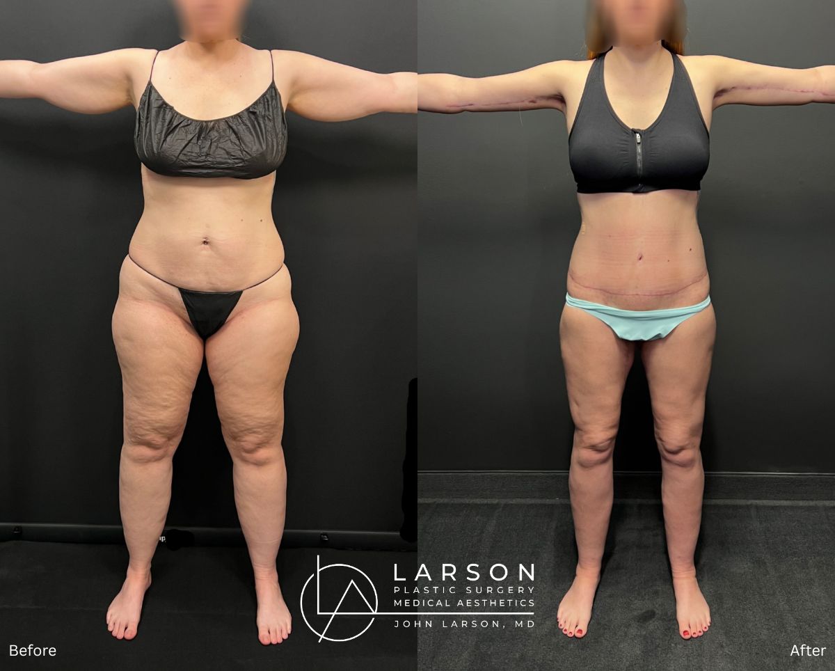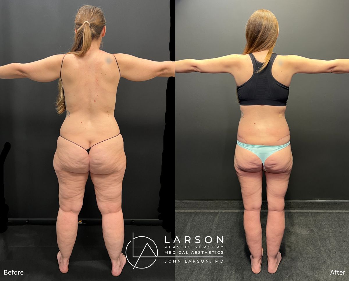 • Stage 1: High-volume lymphatic-sparing liposuction of bilateral legs – 14.9 liters removed + simultaneous medial thigh lift and vertical calf lift