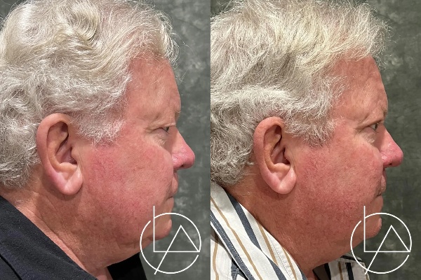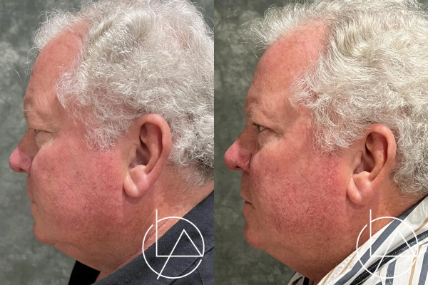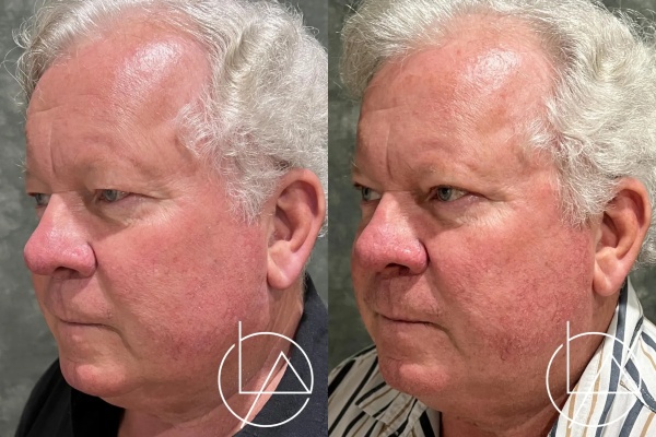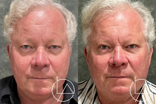 This gentleman, in his 60s, desired rejuvenation of his eyes. He underwent an in-office upper and lower blepharoplasty (eyelid lift) using only local numbing medication. These results are only one month after his operation, demonstrating much improved aesthetics of his upper and lower eyes. His recovery went very smoothly, and he is very happy with his results.