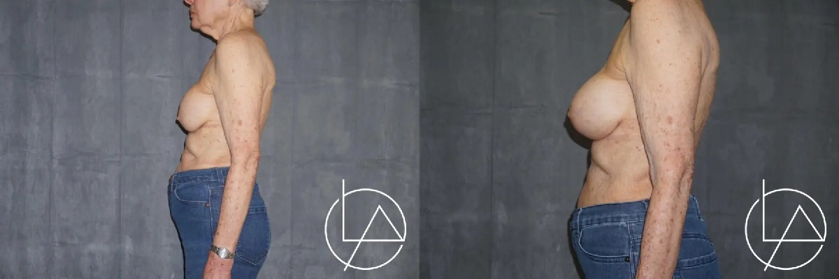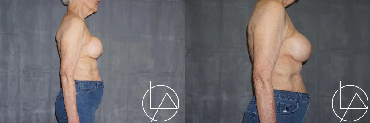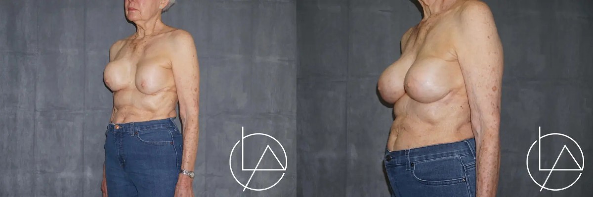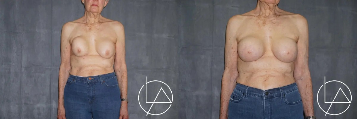 This lovely patient in her 80s had a remote history of previously placed breast implants. After multiple decades, she developed capsular contracture, which resulted in painful, asymmetric breasts. To address the capsular contracture, she underwent bilateral breast revision with removal of her old implants, capsulectomy to remove the diseased capsule, and replacement with new silicone implants. This improved her symmetry and shape, as well as her pain. She’s very happy with her results and is doing well.