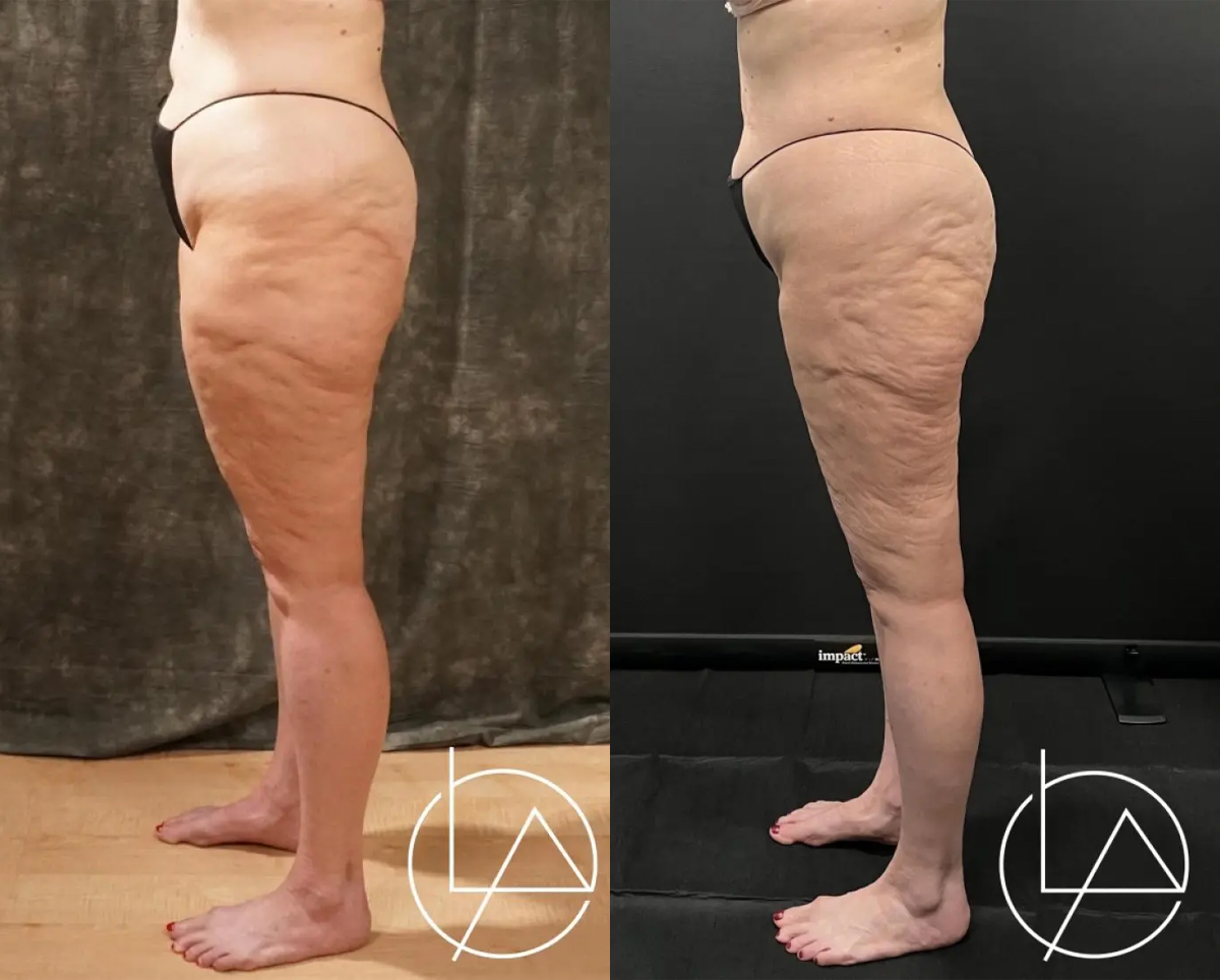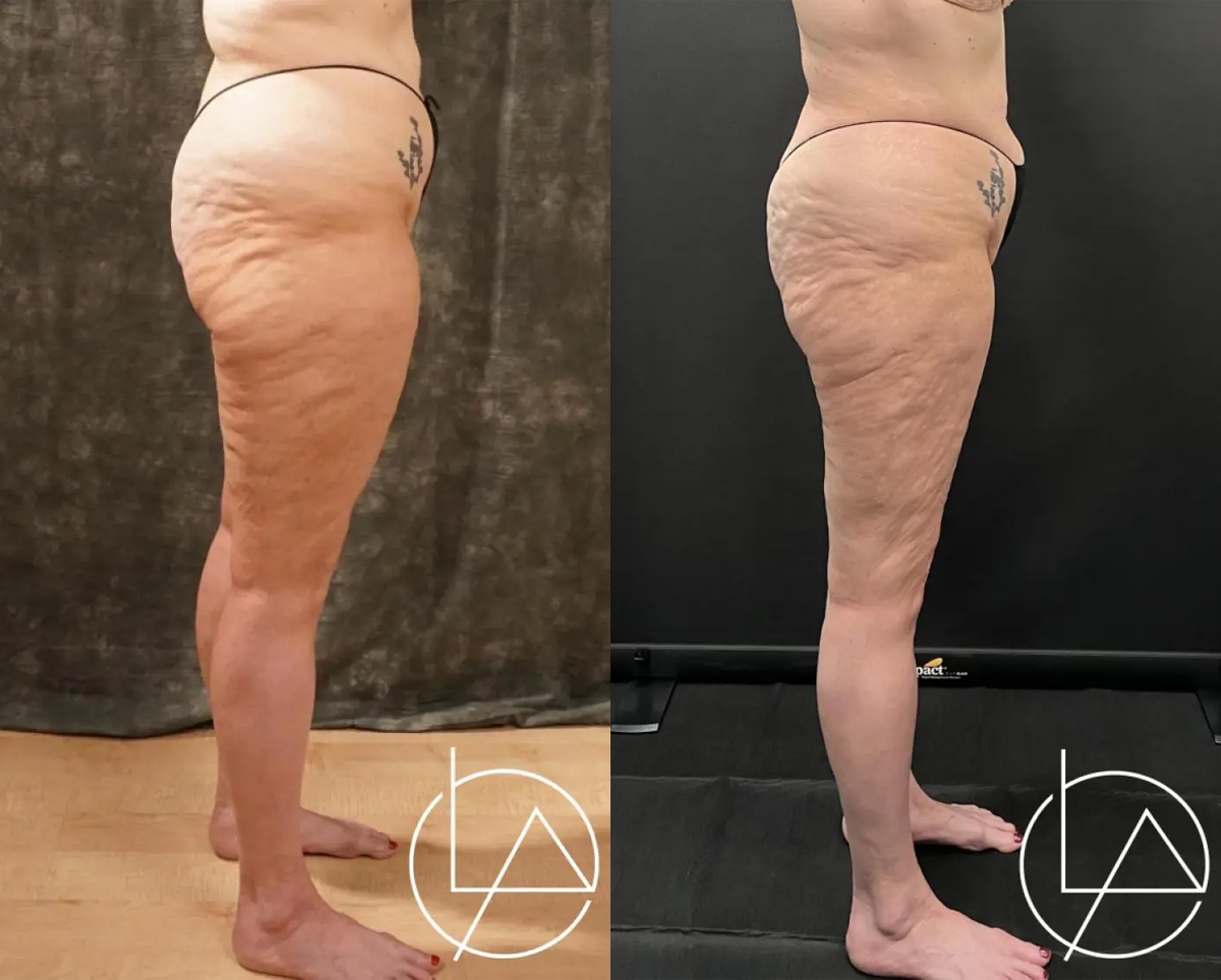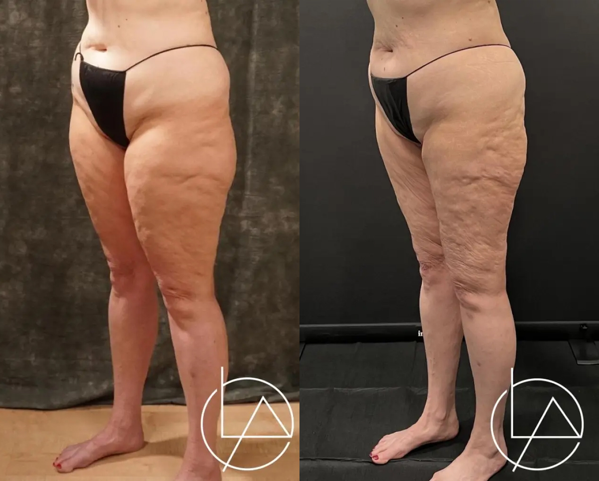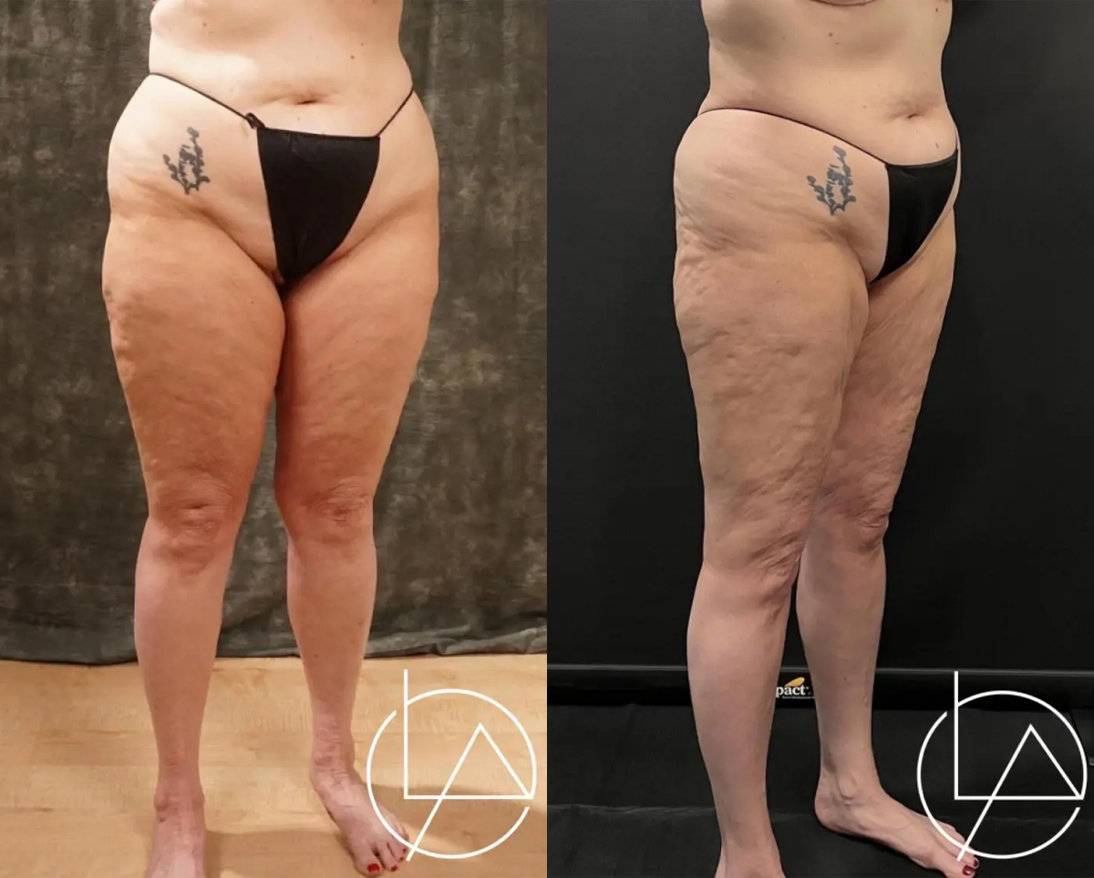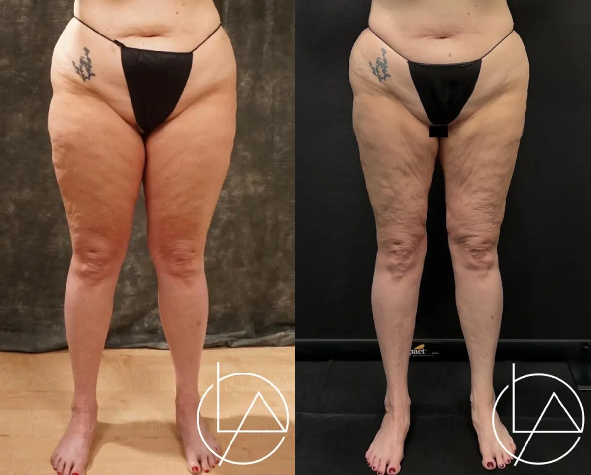 This lovely patient presented to our office with concerns about lipedema in her arms and legs. Given that her legs were the area where she suffered the worst symptoms, we decided to proceed with liposuction of the lower extremities, taking care to address the thighs, knees, calves, and ankles. She has since completed her 2nd stage operation, including liposuction to her arms and legs. For the final stage, we will again perform additional liposuction to the legs as well as the hips, and excision of excess skin.