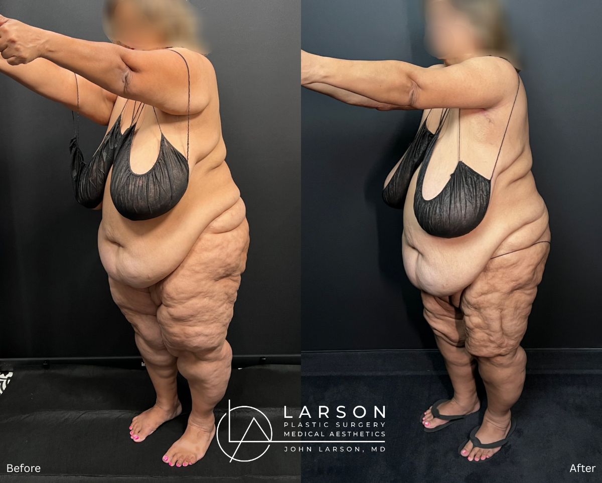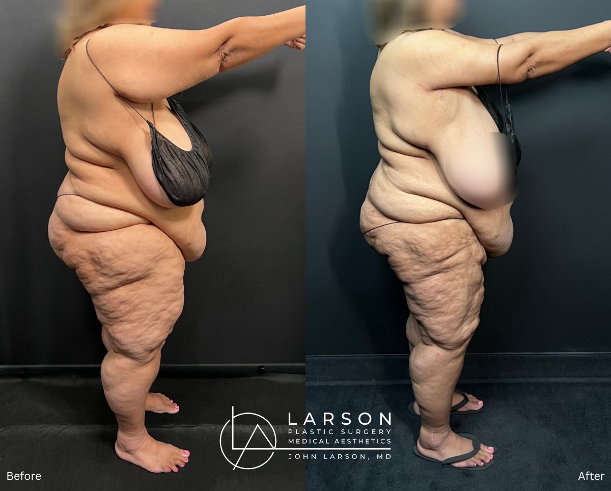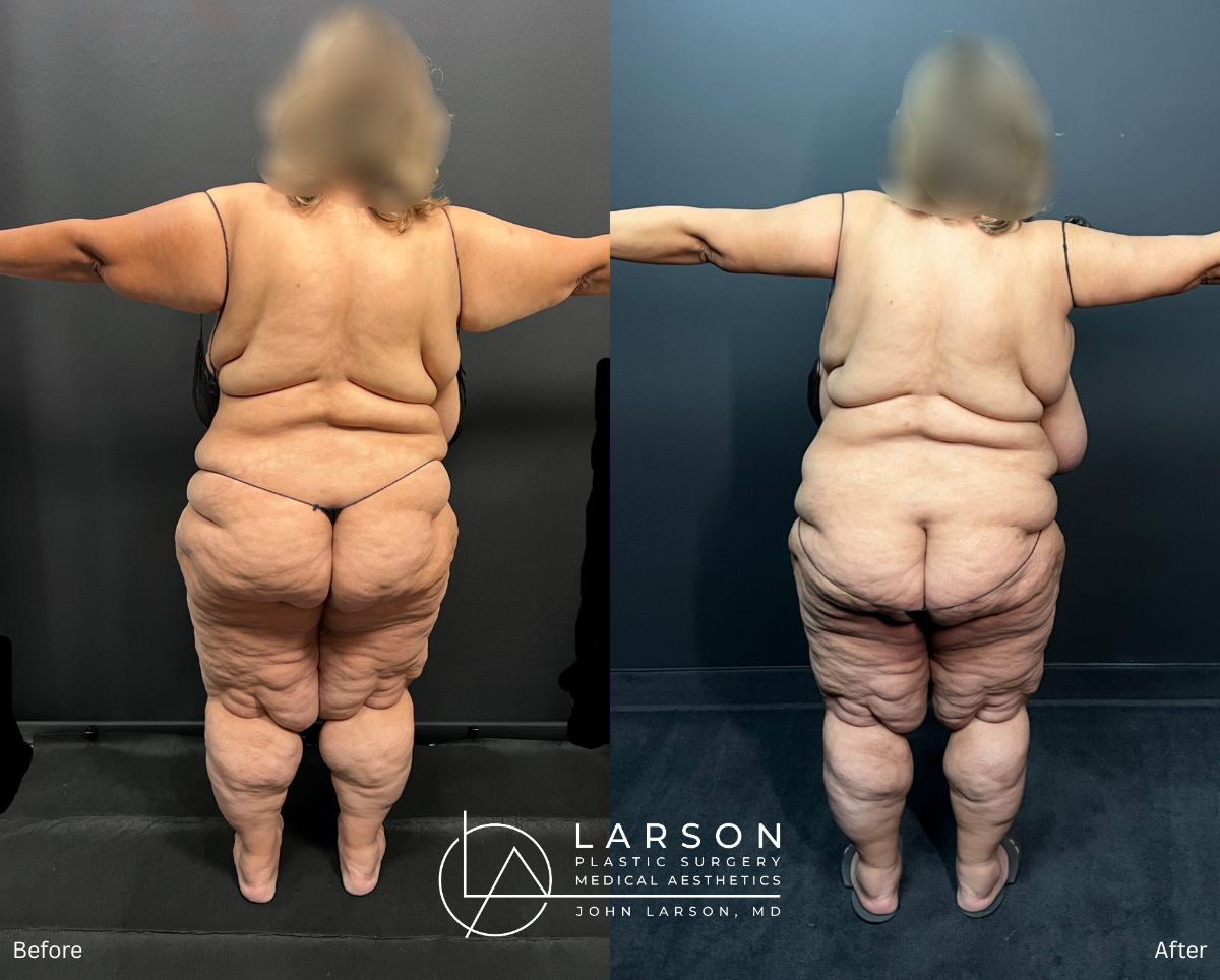 • Stage 3 (just completed; results not shown in current photos): Extensive liposuction of posterior hips, buttocks, and circumferential lower extremities — 13.45 liters of lipedema fat removed