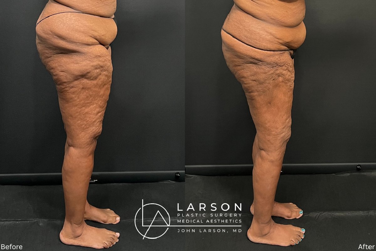 After completing two successful liposuction stages with 8.8 liters removed from her legs and hips and additional volume from her arms, this 63-year-old patient is experiencing significant and sustained relief from the pain, heaviness, and mobility limitations that once dominated her daily life. She now moves with greater ease and comfort, and she is enthusiastically proceeding with the remaining carefully planned stages—further lower-body liposuction combined with thigh and calf lifts, arm skin tightening, and eventual abdominal contouring—to achieve complete symptom resolution and a smooth, proportionate silhouette from head to toe.