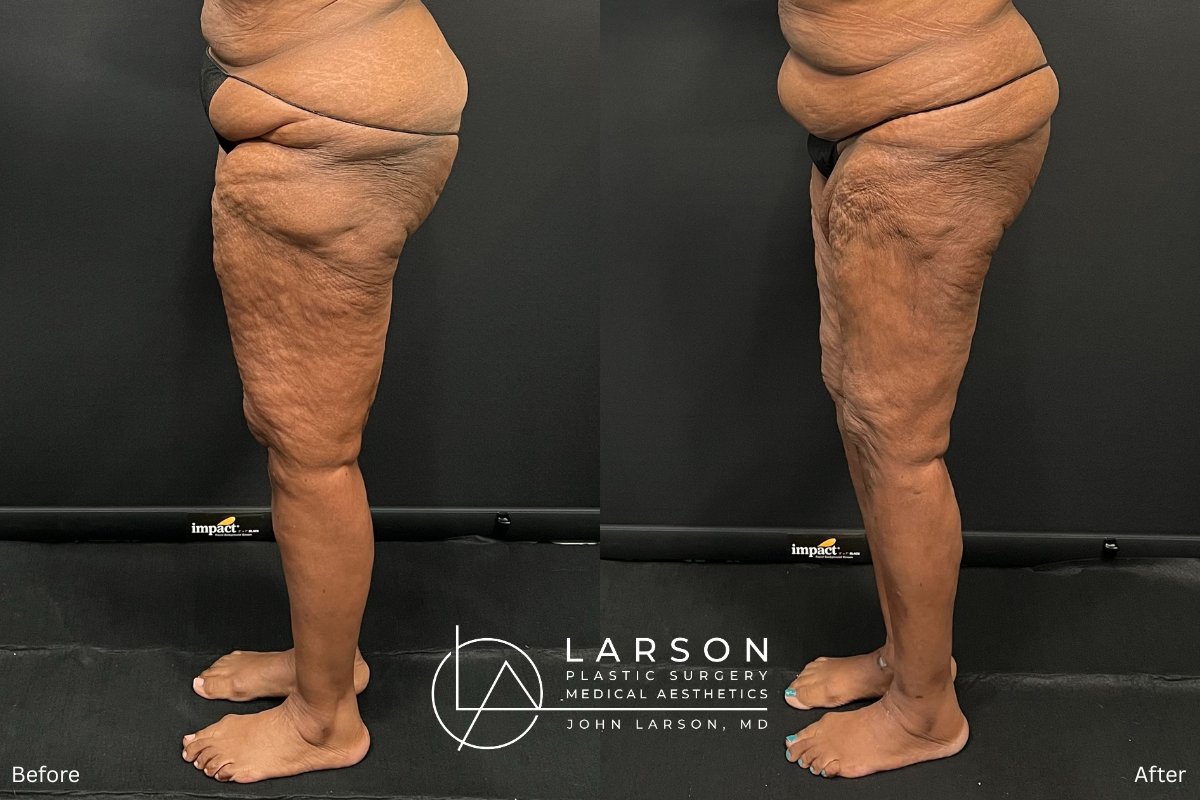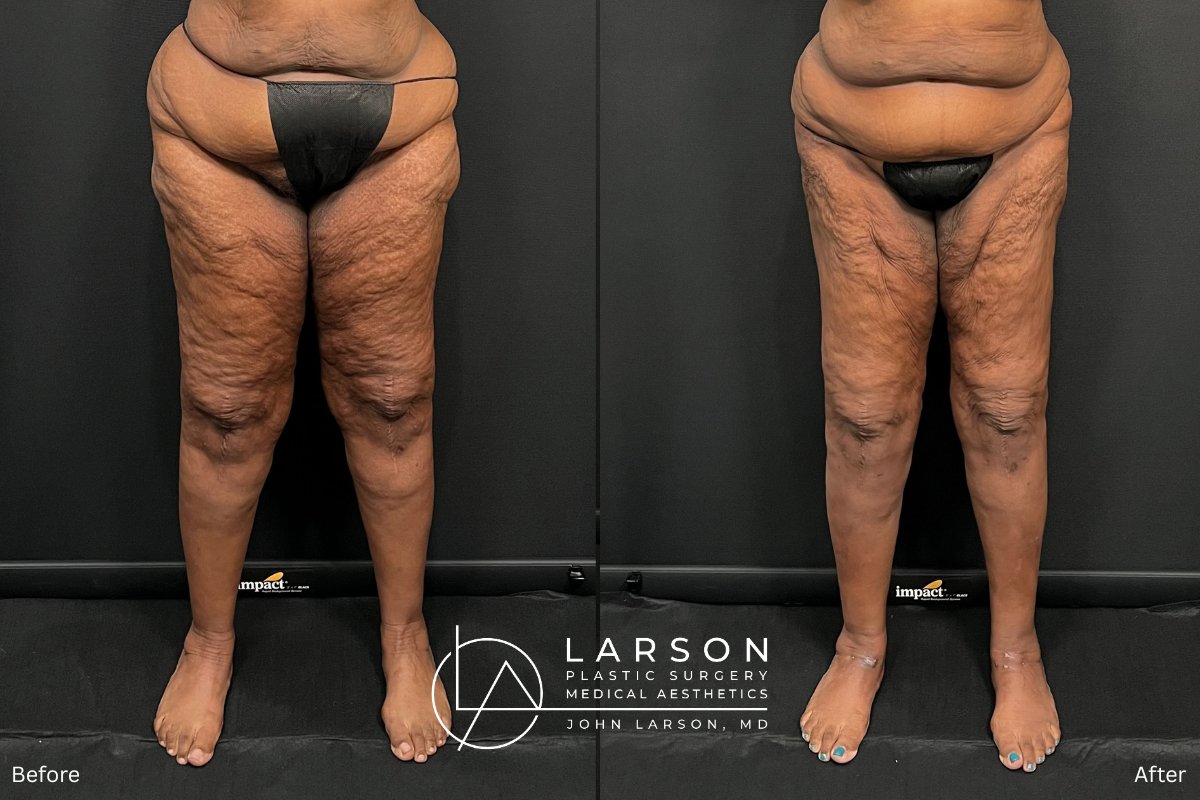 - Stage 1: Power-assisted lymphatic-sparing liposuction of bilateral lower extremities and anterior hips – 8.8 liters removed