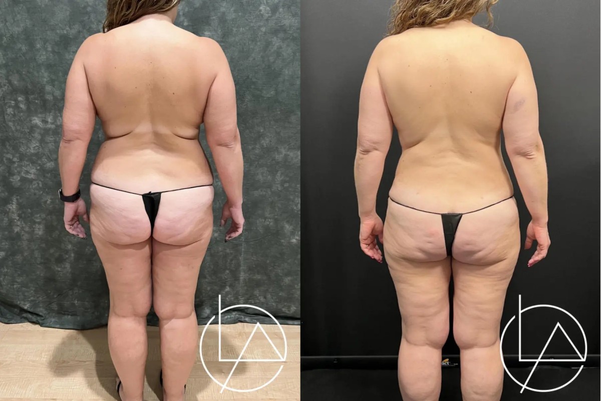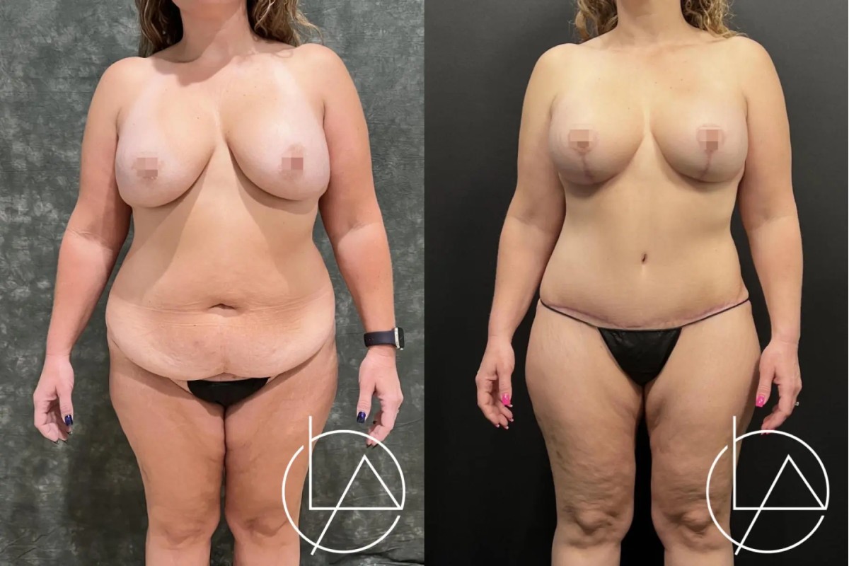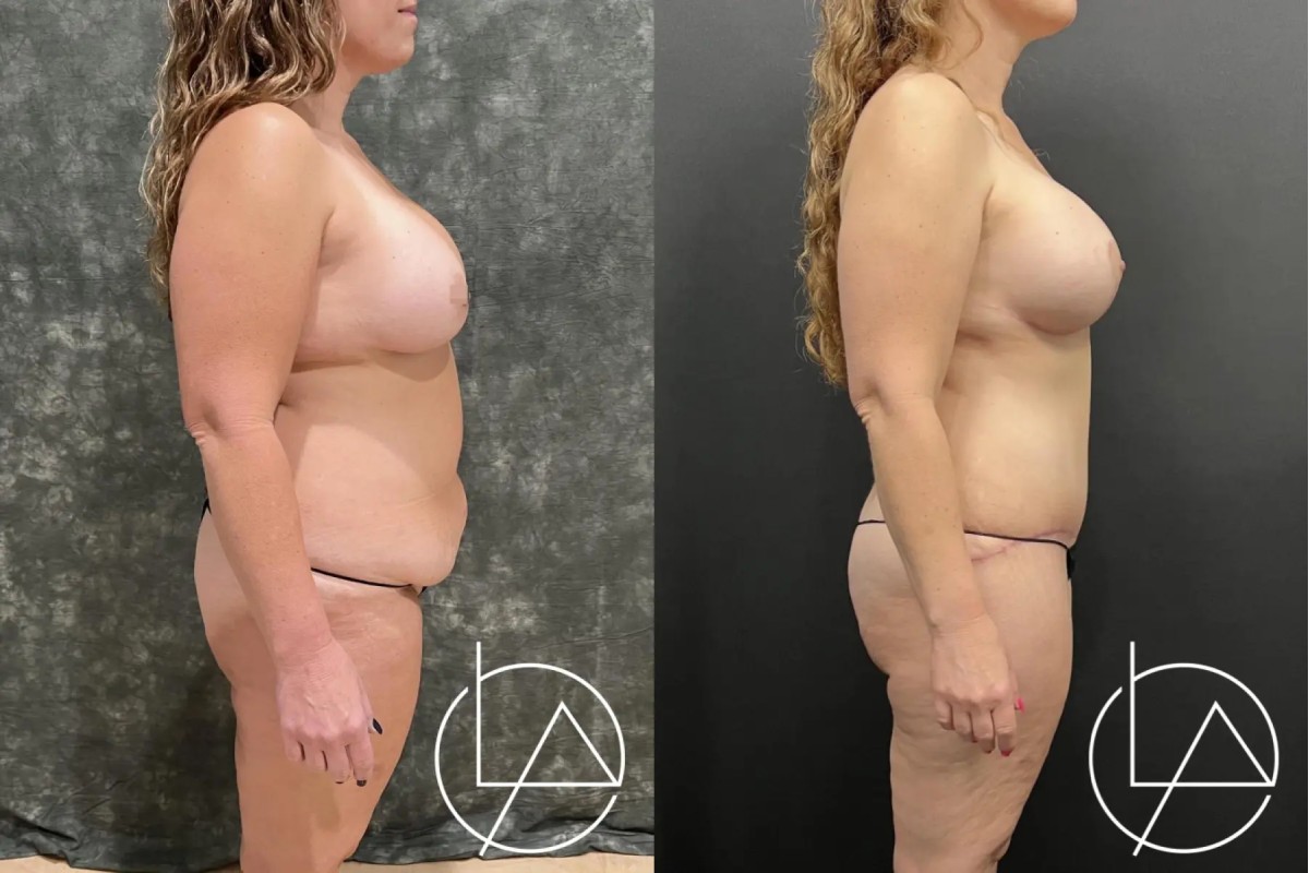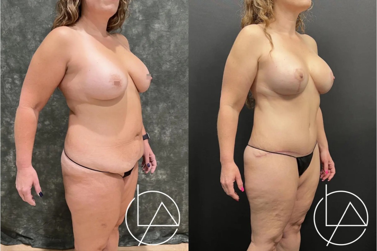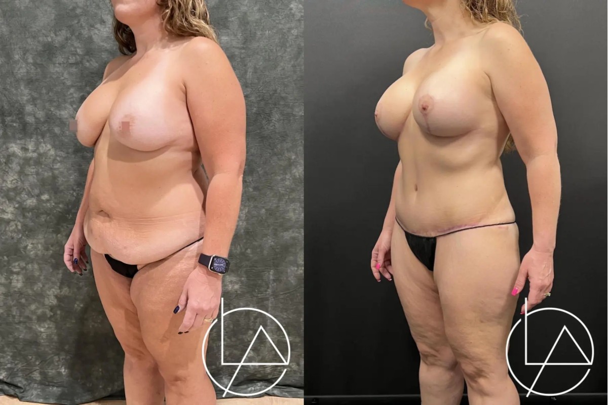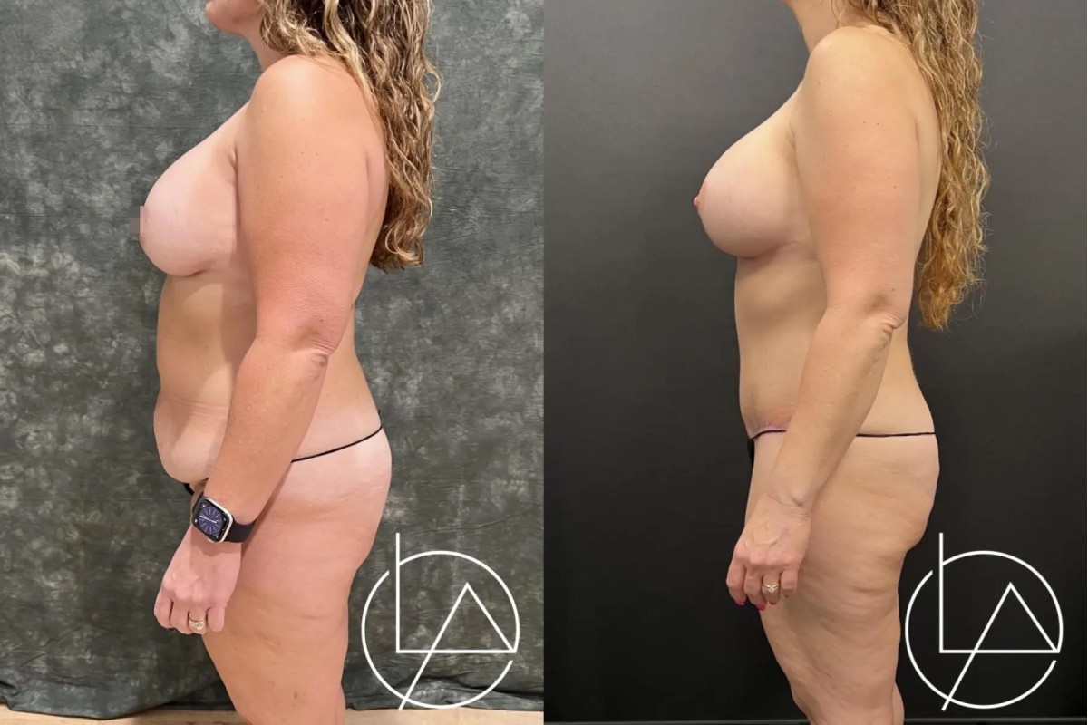 This lovely 48-year-old female desired improvement in her breasts and body. She underwent a mommy makeover, including revision of her prior breast augmentation performed by another surgeon, liposuction of her abdomen, flanks, back, bra roll, and inner thighs, and a drain-less abdominoplasty (tummy tuck). For her breasts, her old implants were removed, the breast pockets revised, and new, larger implants with a higher projection were placed. She did very well with her recovery and is looking fantastic.