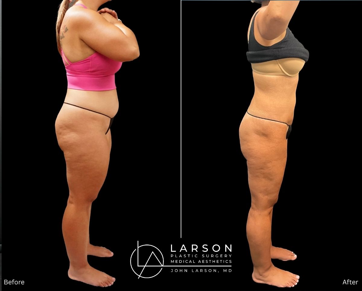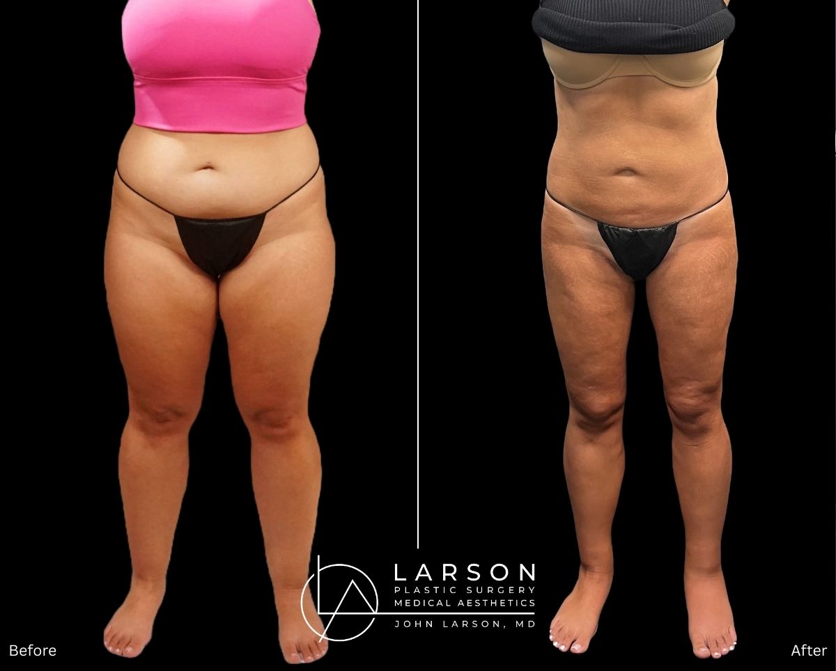 We completed a gentle, two-stage plan using power-assisted liposuction combined with skin-tightening lifts for smooth, natural contours:
